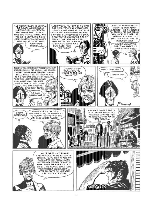 Mushroom Heads begins and ends in Maracaibo, Venezuela, where the antiquarian Levi Colombia finances an expedition to the equatorial Amazon led by Corto Maltese and Professor Steiner, on the trail of the legendary Eldorado. Banana Conga is based on a story by American writer Art Buchwald, taken by Pratt and reworked to explore the idea of a foreign presence forced to leave Mosquito, a small town on the east coast of Honduras. The dangerous and lethal enemy Venexiana Stevenson appears here for the first time, and will reappear in the future. In Voodoo for the president the action moves from Barbados to the fictional island of Port Ducal and a mock trial with a dead president who is believed alive.